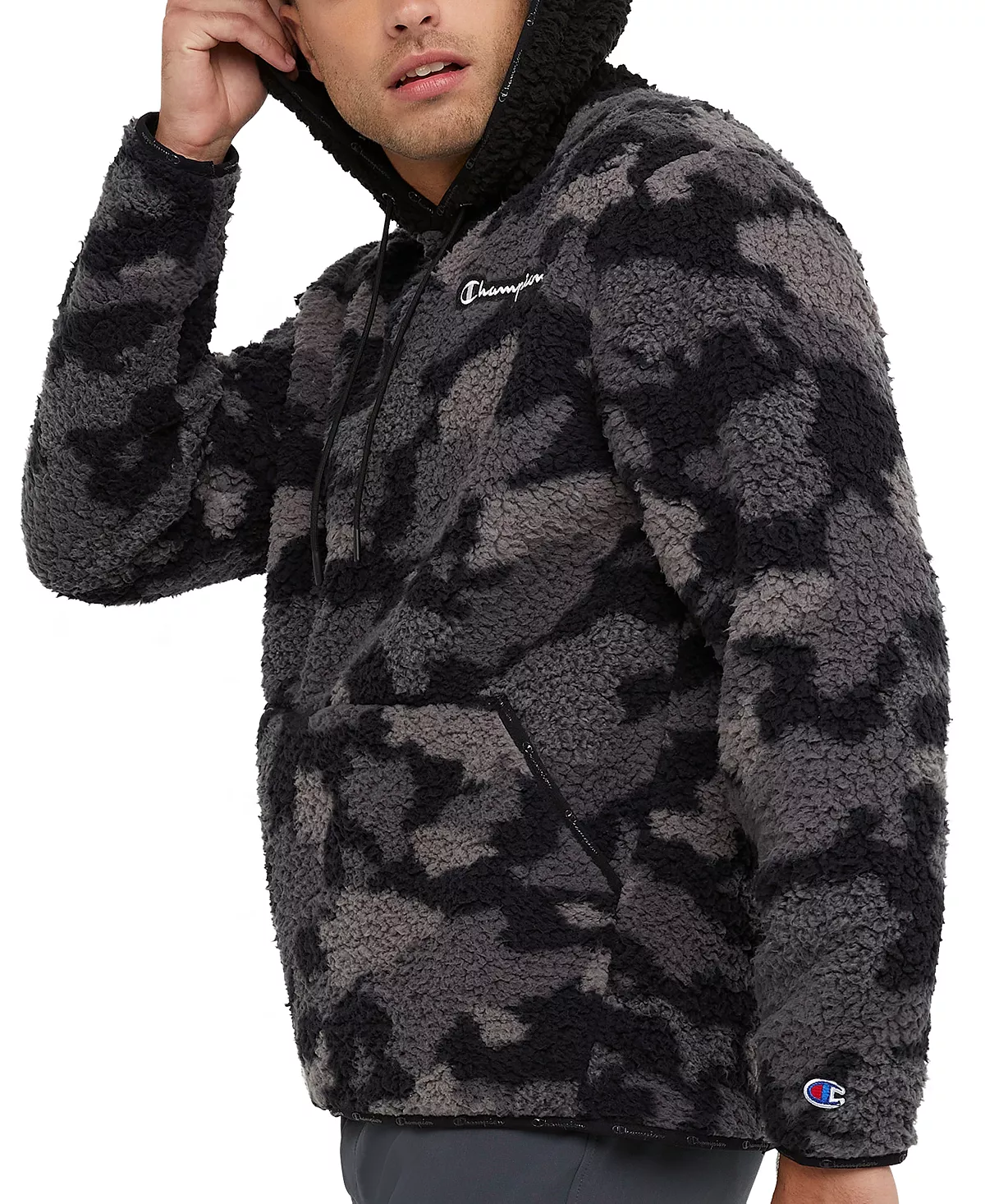 Warm up your laid-back look with the plush fleece fabric and stylish logo detailing of this Cozy camouflage hoodie from Champion.