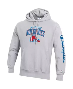 Showcase your fiery Quebec Nordiques fandom while maintaining toasty comfort in this Champion Reverse Weave pullover. Along with a heavyweight design, this pullover offers cozy fleece lining, an adjustable hood and front pouch pocket to keep you comfortable all day long. Best of all, the striking Quebec Nordiques graphics on the chest and iconic brand graphics on the sleeve let everyone know you rep your favorite NHL team in style.